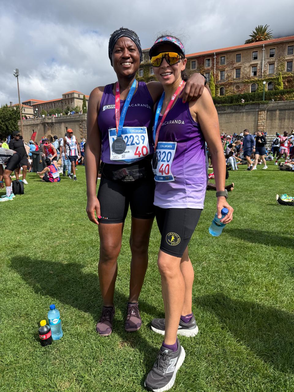 Jacaranda athletes Leila Gani and Gwen Tlaka proudly display their medals after successfully completing the challenging 56km Two Oceans Ultra Marathon.