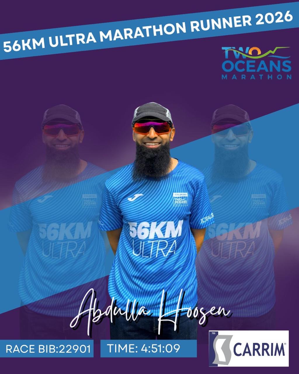 Jacaranda Athletic Club runner Abdullah Hoosen earned the prestigious Sainsbury Medal after an outstanding performance, finishing the demanding 56km race in an impressive time of 4:51:09.