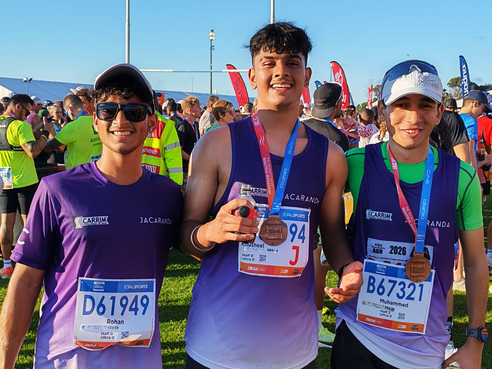 Young Jacaranda runners Rohan Govind, Kusheel Govind and Muhamed Mookadam celebrate their strong performances in the Two Oceans Half Marathon, proudly representing the clubâs rising youth talent.